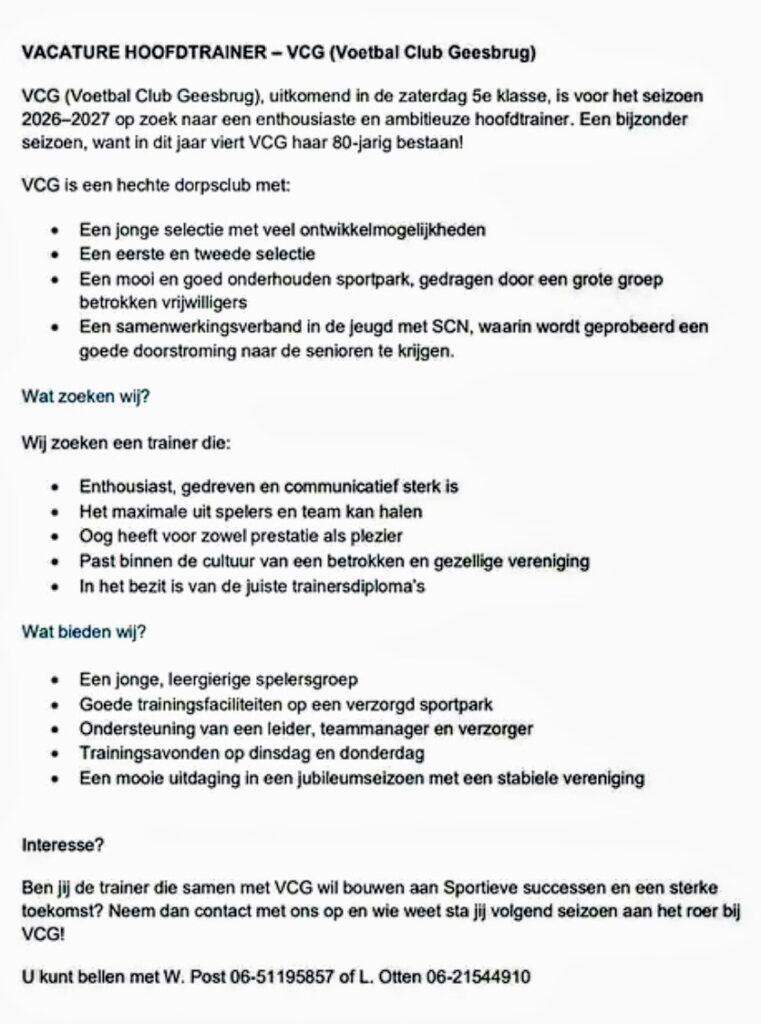 Een promotie, een degradatie en een moeizaam half jaar. Na drie jaar gaan hoofdtrainer Sander Blaauw en VCG uit elkaar aan het eind van het seizoen. De trainer gaat aan de slag bij een zondagvereniging in Duitsland. VCG is daarom op zoek naar een hoofdtrainer voor het seizoen 2026/2027. Een jubileumjaar.